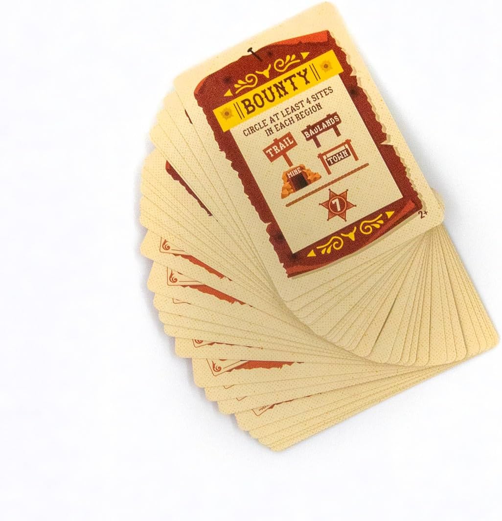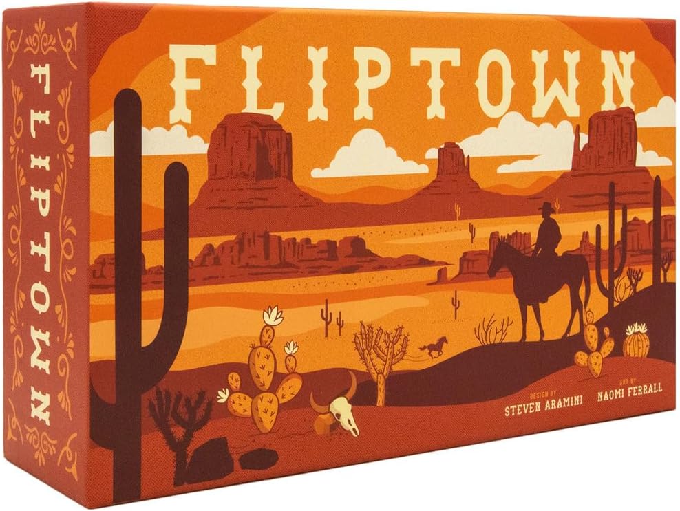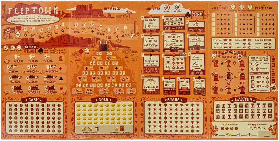 Fliptown is a flip-and-write game in which you are trying to earn stars by exploring a wild west town. The game uses a standard poker deck to drive an open world-style of game play, along with dry erase boards that serve as each player's map. Each turn, flip over three cards, assigning one card to represent your suit, one card to represent your value, and one card to represent your poker card. The suit dictates which of four regions you activate, the value dictates which site within that region you get to circle, and the poker card goes toward a five-card poker hand that is resolved at the end of each round. Each of the four regions — Trail, Badlands, Mine, and Town — offers a different puzzle to master, while each site within a region provides a unique reward such as cash, gold, helpful items like guns, horses and tools, or bonus actions to create powerful combinations. For solo play, you can play to achieve a high score or compete against one of four "cowbot" robot opponents, each with its own motivation. For multiplayer play, players use "community cards" in the center of play, with players resolving each turn simultaneously. Additionally, bounty cards add competitive goals that players are racing to achieve. In addition to the standard game, you can play as one of 14 wild west characters. Each character has a unique set of starting resources and a unique special ability.