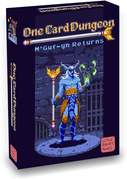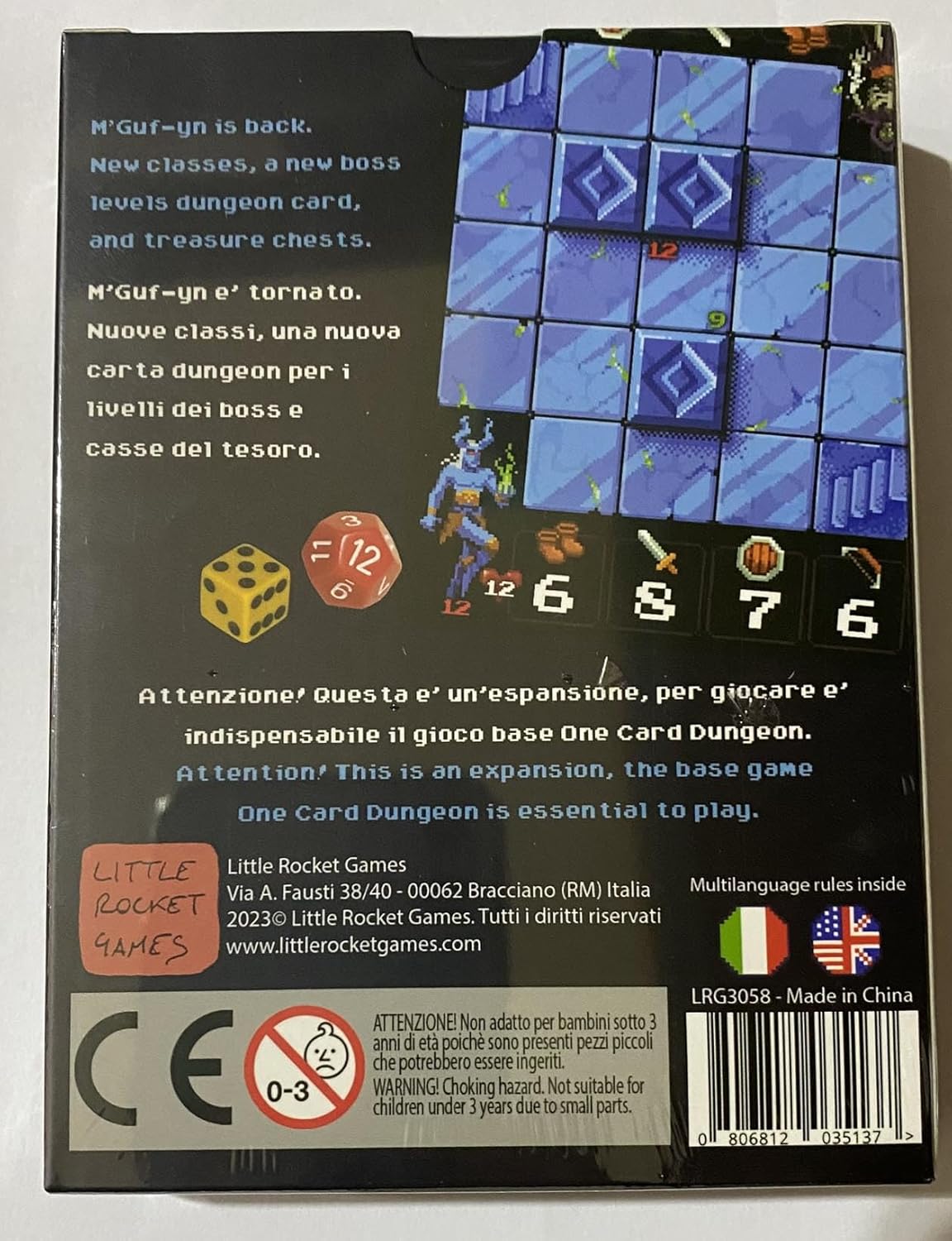 M'Guf-yn Returns, the first official expansion of One Card Dungeon. So many new things will bring One Card Dungeon to a high level! M'Guf-yn is back, awakened by his sleep, is ready to take hold of what has been stolen from him: the whole world. Returning possession of his mighty scepter, from the bottom of his hellish throne, he is determined to sow chaos, destruction and despair. You are the only valiant one who can stop his devilish plan of conquest. Are you ready to go back into the Dungeon? This time, in addition to his armies, you must also defeat his terrible commanders, before reaching the final battle against the lord of the underworld. (Requires basic game.) CONTENTS 1 Dungeon card (front/back), 2 Class cards (front/back), 1 yellow Treasure Cash die, 1 D12 Boss die. Age: 10+ Players: 1 Playing time: 15-60 minutes